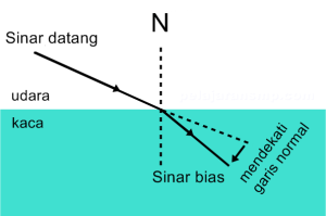 Sinar datang, garis normal, dan sinar bias terletak pada satu bidang dan berpotongan di satu titik, sinar datang dari medium kurang rapat menuju medium yang lebih rapat dibiaskan mendekati garis normal. Sebaliknya, sinar datang dari medium lebih rapat ke medium kurang rapat dibiaskan menjauhi garis normal. Berikut gambarannya :