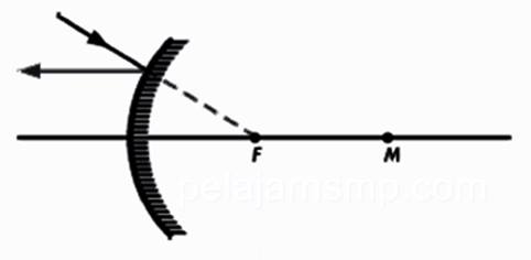 – Sinar datang sejajar sumbu utama dipantulkan seakan-akan berasal dari titik fokus F. Berikut gambarannya :