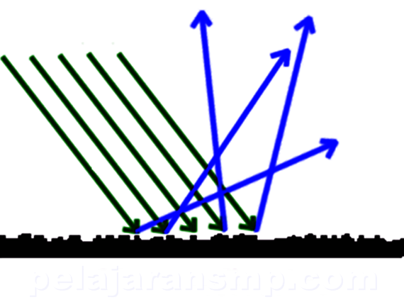 – Pemantulan baru, terjadi jika berkas sinar yang sejajar jatuh pada bidang tidak rata sehingga sinar dipantulkan ke segala arah. Berikut gambarannya :