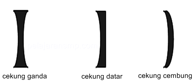 – lensa cekung adalah lensa yang bagian tengahnya lebih tipis daripada bagian tepinya, sifat bayangan yang dibentuk lensa cekung adalah maya, tegak dan diperkecil. Jenis-jenis lensa cekung diantaranya adalah :